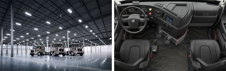 The new Volvo VNR model features a modern, ergonomic driver environment (left) across its three models, the VNR 300 daycab, VNR 400 42” sleeper and the VNR 640 61” sleeper.