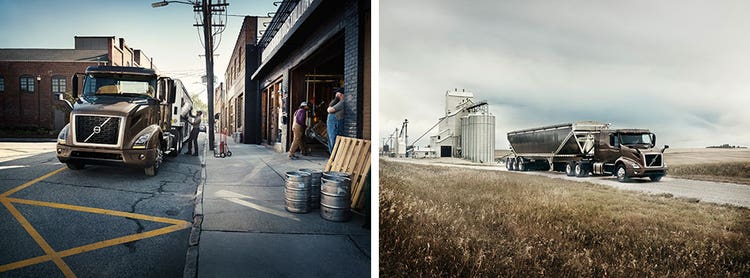 The versatile new Volvo VNR regional haul model offers a 113” BBC and 50-degree wheel cut to excel in urban environments (left), while the aerodynamic design and powertrain packages provide exceptional fuel efficiency.