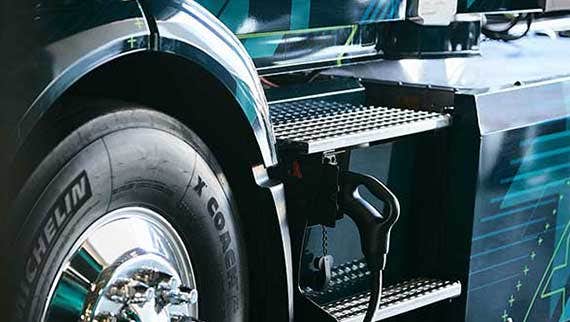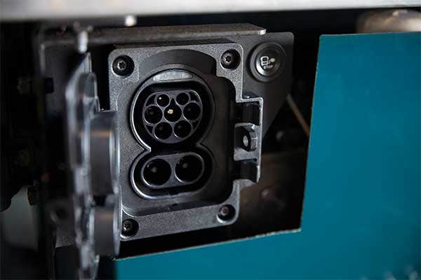CAPTION: The CCS2 connector and charging port location on the Volvo VNR Electric truck model.