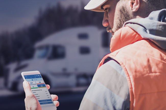 CAPTION: Volvo Trucks North America has expanded its partnership with Geotab by offering Geotab Drive + Fleet for Volvo Trucks, which provides insights to fleet managers and drivers through a cloud-based platform. A professional driver changes duty status on the Geotab Drive app.