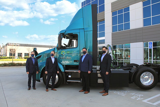 CAPTION: Chris Jagnow, regional fleet manager, Volvo Trucks North America and Tony Borgic, new truck salesman, Gateway Truck & Refrigeration, delivered Quality Custom Delivery’s (QCD) first Volvo VNR Electric to Michael Douglas, senior director of strategic procurement, QCD, and Blake Bunte, general manager, QCD Fontana.