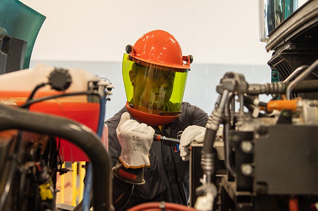 CAPTION: A trained technician wearing personal protective equipment removes the junction box on a Volvo VNR Electric truck to verify there is no voltage in the traction voltage system.