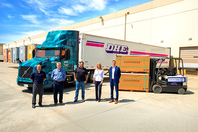 CAPTION: Jason Jasick, Vice President, Road Logistics USA, Kuehne+Nagel; Troy Musgrave, Director of Process Improvement, DHE; Mitchell Burdwell, North America Senior Manager, Logistics and Distribution Operations, SunPower; Tracey Craik, Regional Sales Director, TEC Equipment; and Jared Ruiz, eMobility Regional Sales Manager - West Region, Volvo Trucks North America, convene to commemorate the new sustainable supply chain collaboration where DHE will transport solar PV products for SunPower using its Volvo VNR Electric trucks.