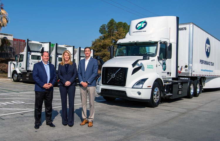 CAPTION: Michael Gallagher, head of indirect sourcing, North America, Performance Team, Tracey Craik, regional sales director, TEC Equipment and Jared Ruiz, acting head of electromobility sales for North America, Volvo Trucks North America with Performance Team’s Volvo VNR Electric fleet at their Santa Fe Springs facility.