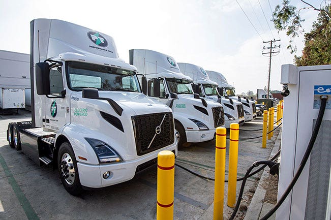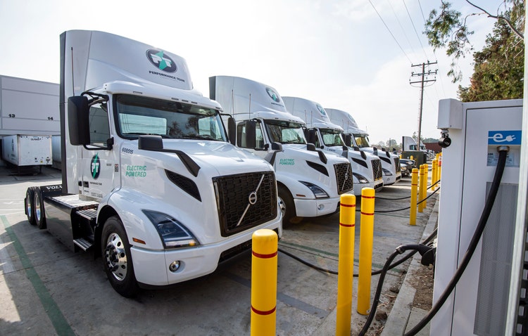 CAPTION: A lineup of Volvo VNR Electric trucks charging at Performance Team’s Santa Fe Springs facility.