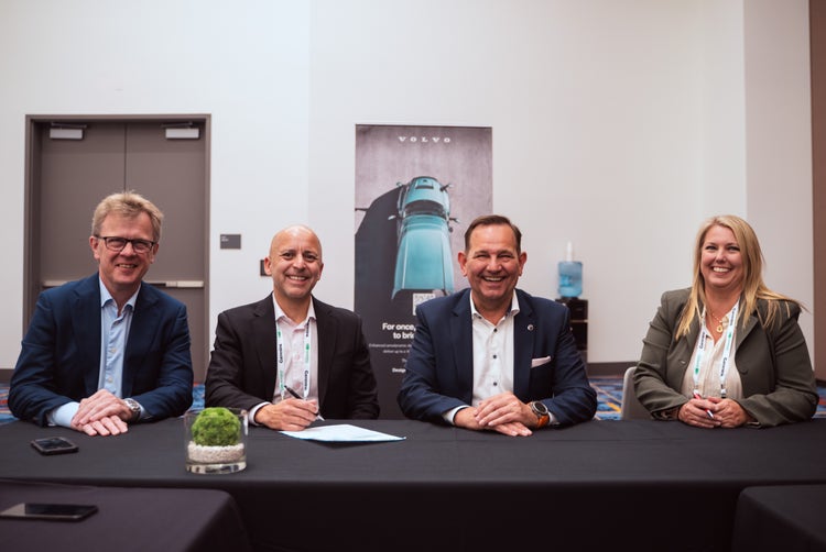 CAPTION: Volvo Trucks North America customer Hight Logistics signed a sales order at the recent Advanced Clean Transportation (ACT) Expo in Las Vegas to add 24 Volvo VNR Electric trucks to develop the new Hight Electric division, focused exclusively on acquiring battery-electric vehicles and developing supporting charging infrastructure. Pictured L-R Roger Alm, global president of Volvo Trucks; Rudy Diaz, founder and chief executive officer of Hight Logistics; Peter Voorhoeve, president of Volvo Trucks North America; and Melanie Des Laurier, new truck sales at TEC Equipment.