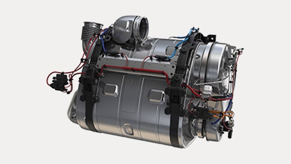 "One-box" aftertreatment system offers smaller packaging and reduces weight by 17 pounds from previous systems. Provides better thermal encasing of exhaust energy, improves muffler efficiency.